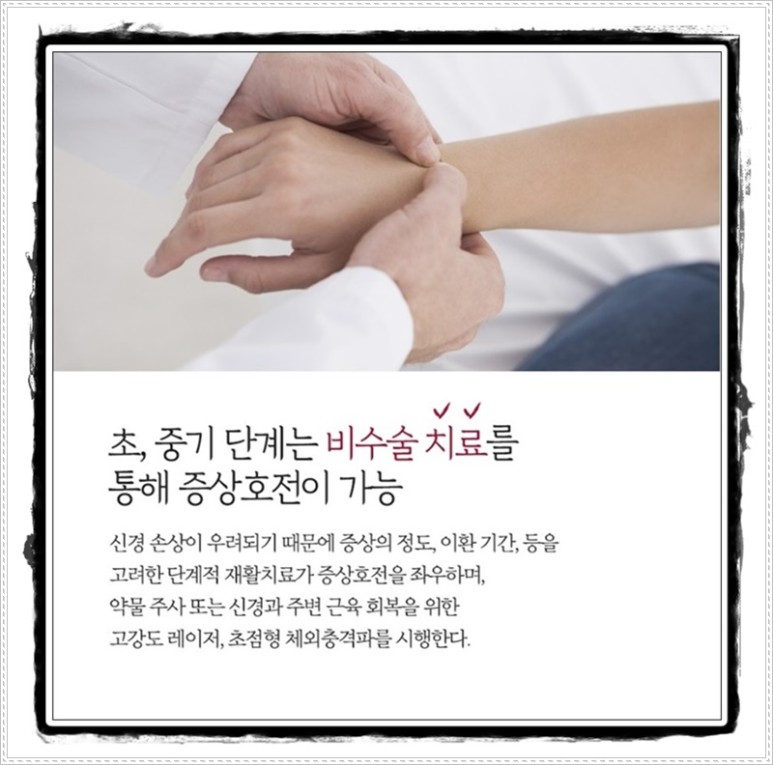 그러나 치료에 대한 부담 또는 근육통으로 오인하여 진통소염제, 파스, 보조기 등을 이용한 자가치료를 선행하는 경우가 있는데 이는 오히려 증상을 악화시키는 원인이 될 수 있으나 나중에 수술을 해도 완치를 장담할 수 없어 후유장애가 남을 수 있으므로 주의해야 합니다.