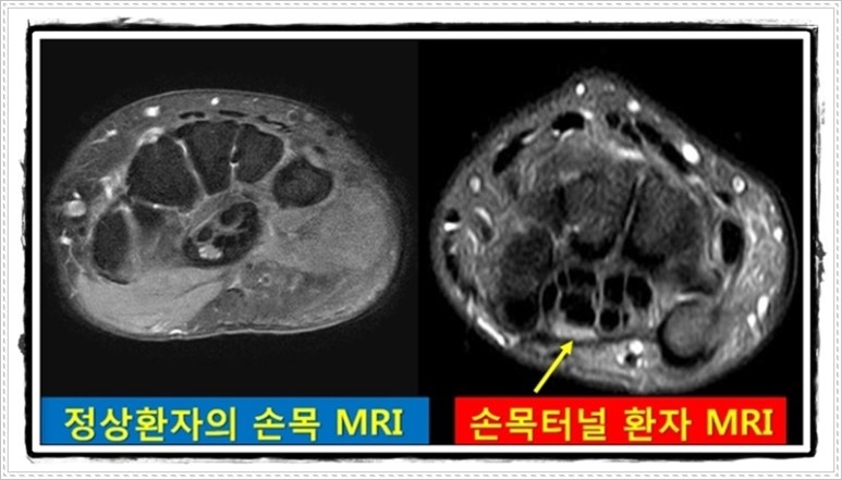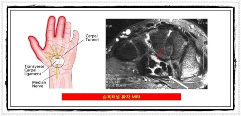 이 질환은 손목에서 손에 잡히는 부위에 뼈와 인대로 둘러싸여 있는 수근관(손목터널) 내부의 신경이 붓는 질환으로 수근관 안에는 힘줄과 신경 등 10개의 구조물이 밀집하여 일부가 조금만 붓더라도 상대적으로 약한 신경이 눌리는 질환입니다.