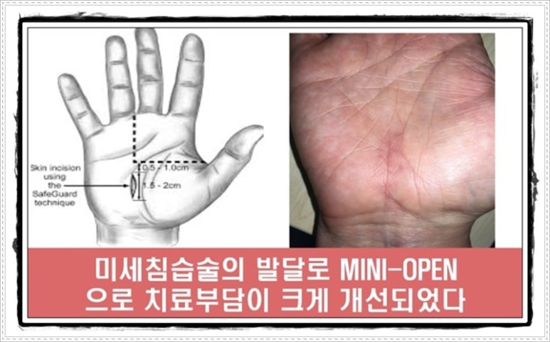 방법은 종이로 잘리는 것보다 작은 1cm 내외의 절개로 수근관터널을 압박하는 횡수근 인대를 유리하게 하고 통증과 절개부위 회복, 감염예방을 위한 치료지연 문제가 줄어들어 빠른 회복이 가능하게 되었습니다.