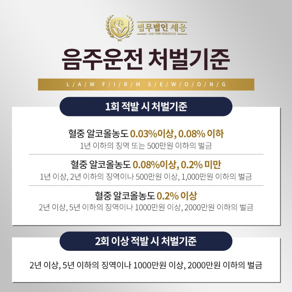 실제, 음주 운전으로 실형 판결을 받는 벌칙의 정도는 더욱 더 높아지고 있기 때문에, 주의를 기울일 필요가 있습니다. 과거의 처벌을 생각하면서 쉽게 판단하고 쉽게 넘어가다 인생에 지워지지 않는 큰 오점이 생길 수 있습니다. 돌이킬 수 없는 일을 저질렀다면 회피하고 마는 것이 아니라 최악의 상황에 처하기 전에 빨리 문제 해결을 위해 결론을 내리고 해결해 나가면 도움이 되는 방법도 생각할 수 있습니다.