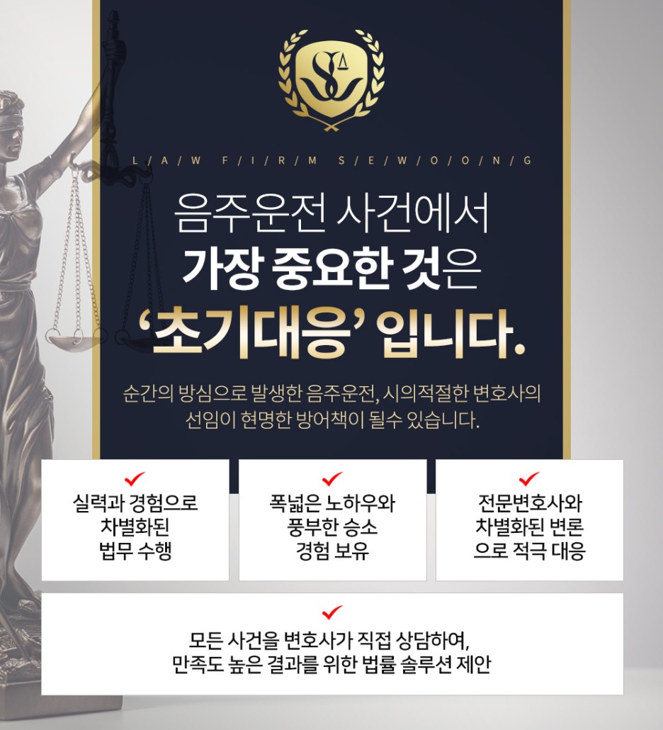 각기 다른 우리지만 모두 법의 테두리 안에서 살고 있고, 그러한 법규를 통해 사회의 안정화가 이루어지고 있는 만큼 위반 행동에 대해서는 엄격한 처벌이 행해질 가능성이 있습니다. 본인이 생각했던 것과 너무나 다른 엄중한 법심판으로 인해 당혹스러운 사안이라면 해당 사건에 대한 해박한 지식과 다양한 노하우, 경험을 두루 갖춘 장소에서 도움을 청하는 것이 음주운전 실형의 위기를 모면하기 위한 현명한 방법입니다.