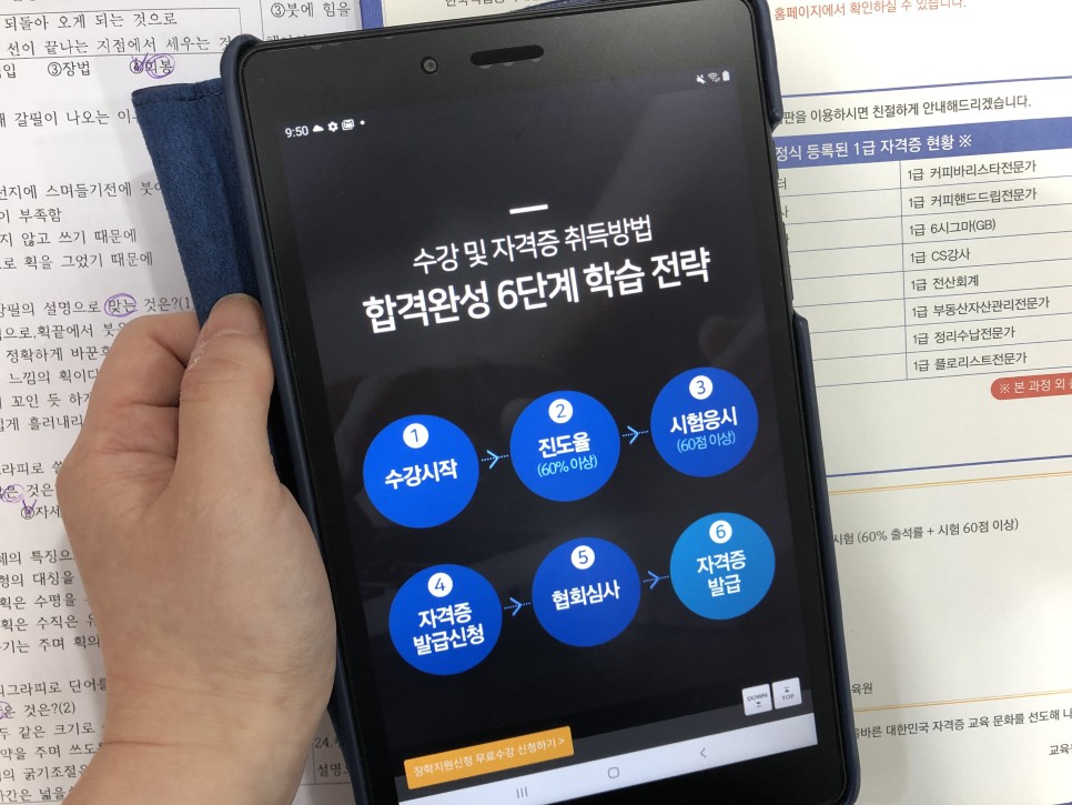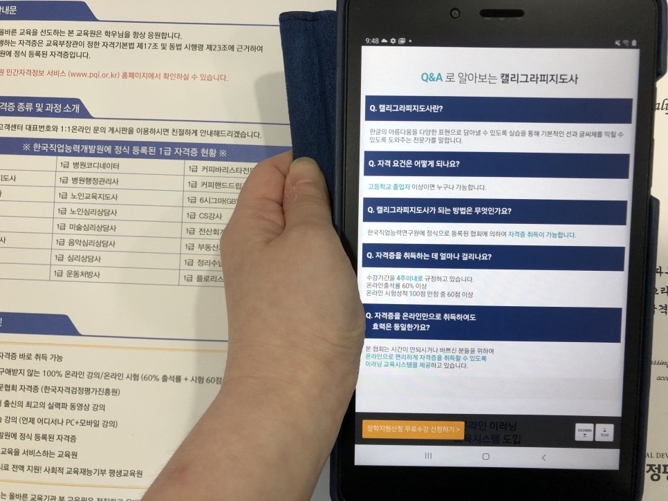이곳은 한국직업능력개발원에 정식 등록되어 있기 때문에 공신력은 인정받으면서도 캘리그라피 자격증을 쉽게 취득할 수 있다는 장점이 있었습니다. 무엇보다 가장 큰 장점은 모든 과정을 100% 지원해 준다는 점이었어요