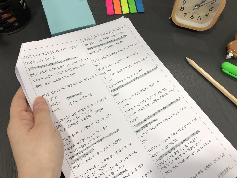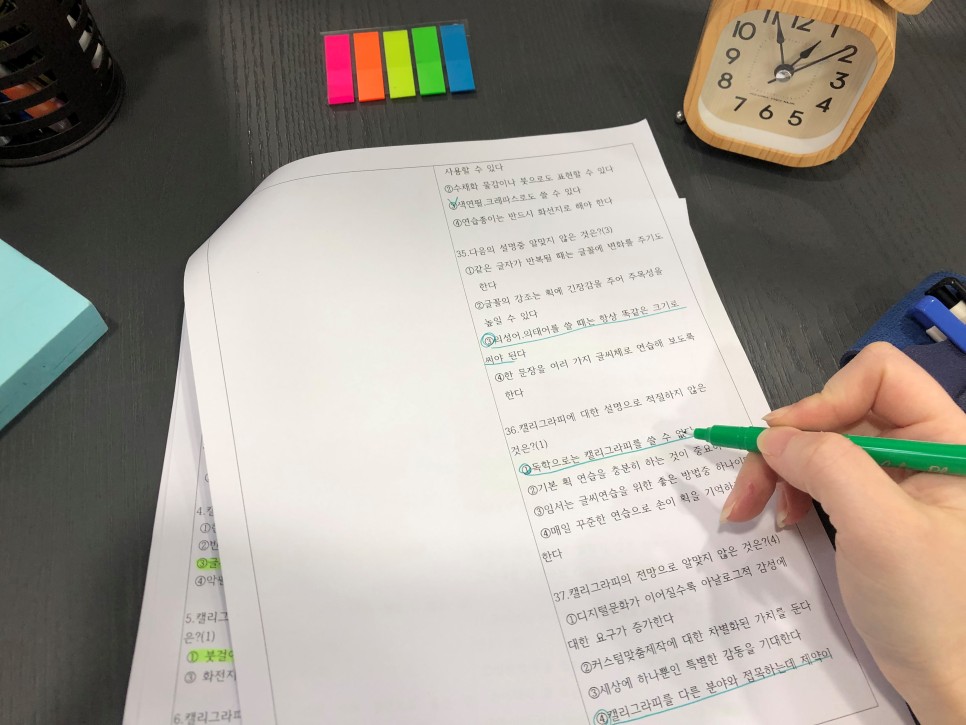 캘리그라피 자격증 준비하신 분들은 아시겠지만 미술 용어에만 신경을 써서 암기해 놓으면 다른 부분은 어렵지 않잖아요. 그래서 시험 보기 전에 집에서 혼자 타이머를 맞춰놓고 모의고사를 봤는데