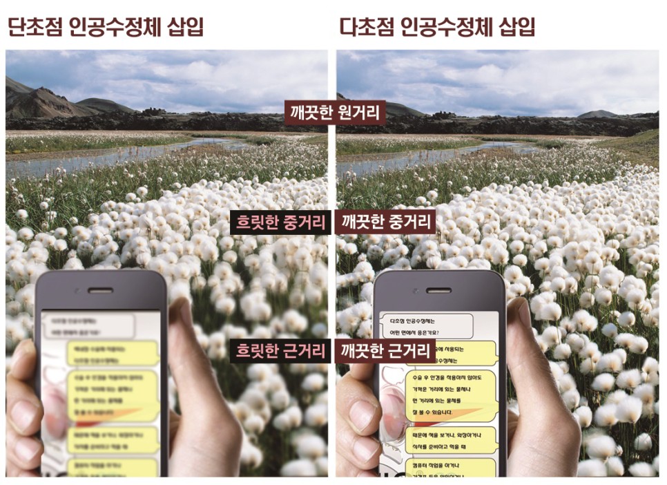 지금부터 인공수정체라는 단어 대신 렌즈라고 표현을 해볼게요 기존 백내장 수술은 단초점 렌즈를 사용했지만. <단초점 렌즈는 근거리와 원거리 중 한 곳에만 초점을 맞출 수 있도록 제작>되었습니다. 단초점 렌즈를 삽입하기 전에 환자 분은 고민을 할 필요가 있습니다. 평소에 가까운 거리를 잘 보는지, 먼 거리를 잘 보는지. 만약근거리를많이보기때문에매번돋보기사용이불편하다면근거리초점렌즈삽입후원거리를볼때마다안경을사용하셔야합니다. 반대로 원거리에 초점을 맞췄다면 확대경을 사용해야 합니다. 보통은 근거리를 보는 일이 많지 않기 때문에 원거리에 초점을 맞춘 후 필요할 때만 돋보기를 착용하는 경우가 많습니다. 이렇게 단초점 렌즈를 삽입하면 필요할 때 안경을 써야 하는 불편함이 있지만 적어도 시력 교정은 잘 할 수 있기 때문에 안경 사용이 불편하지 않다면 단초점을 사용해도 충분히 생활할 수 있습니다.