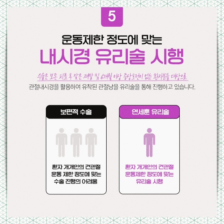 하지만 내시경 유리술의 경우 환자 개개인의 어깨관절 운동 제한 정도에 따른 유리술을 시행하므로 이점을 살릴 수 있을 것입니다.