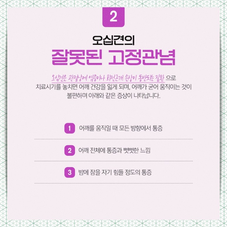 잘못된 고정관념은 50대 전후에 걸린다는 사실 이외에도 다양합니다.밤에 통증이 나타나면 이 병이라고 생각하시는 분들도 가끔 계십니다. 그 뿐만 아니라 오십견 수술이나 보존 치료, 어느 하나라도 받아도 좋다고 생각하는 분도 계십니다.