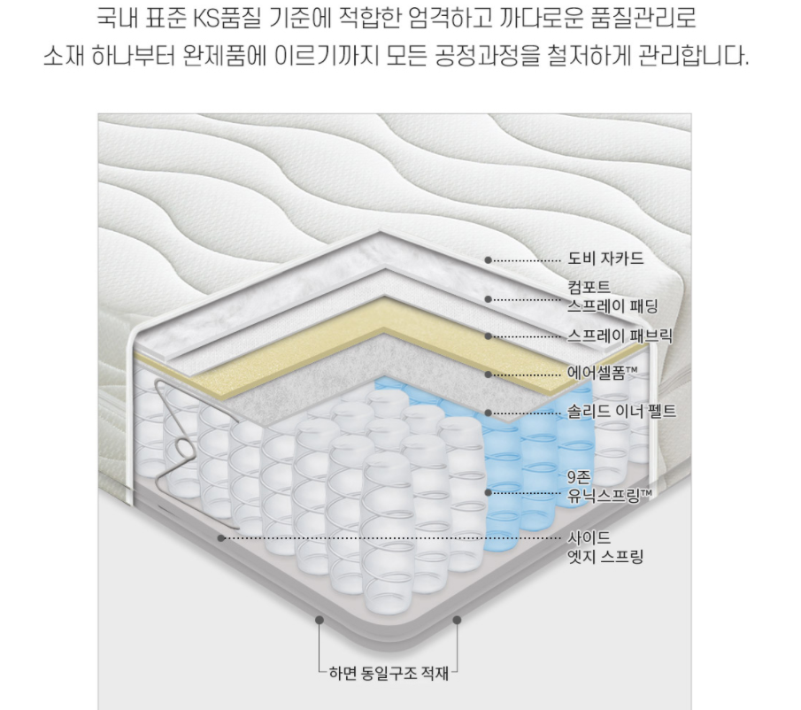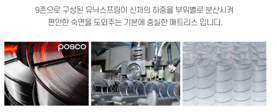 9존으로 구성된 유니크 스프링이 몸의 하중을 부위별로 분산시켜 편안한 수면을 도와주는 기본에 충실한 매트리스입니다.