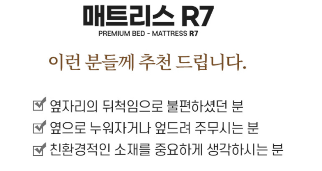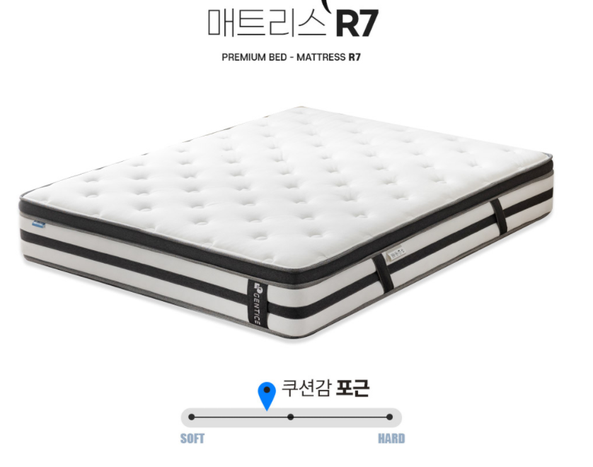 매트리스 R7은 쿠션감은 푹신한 중간에서 부드러움에 가깝네요!