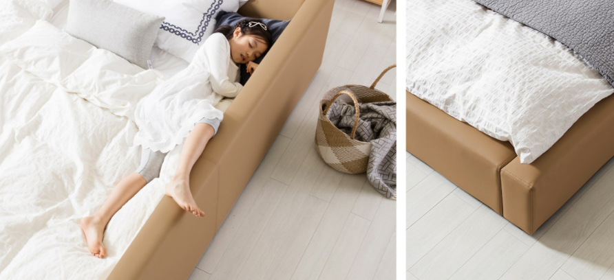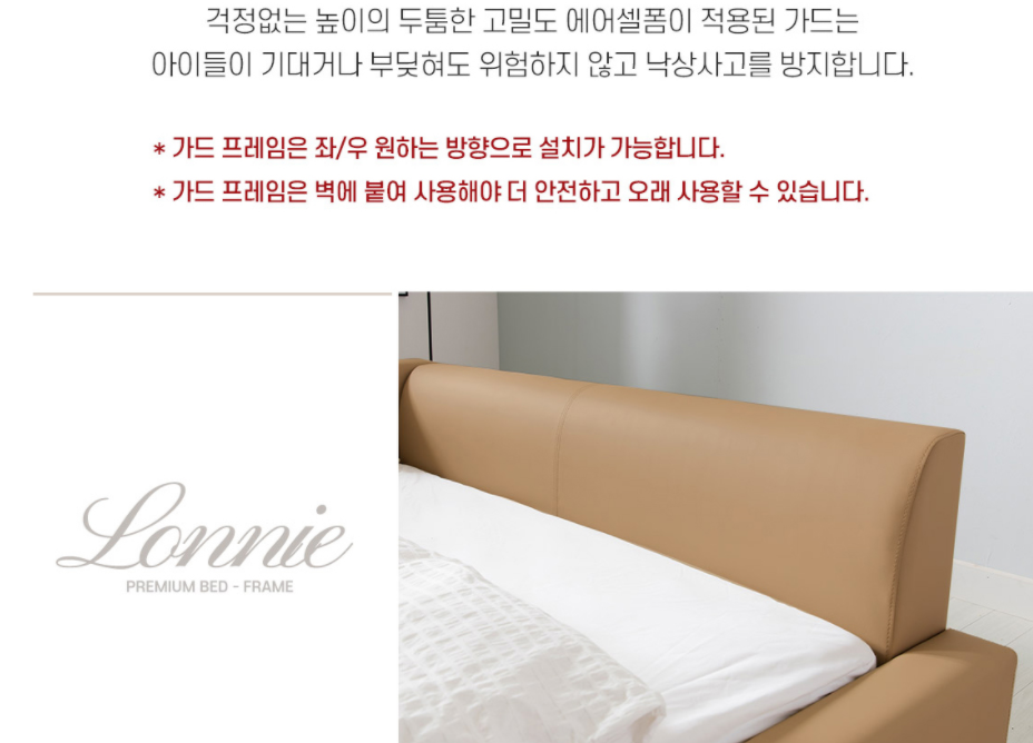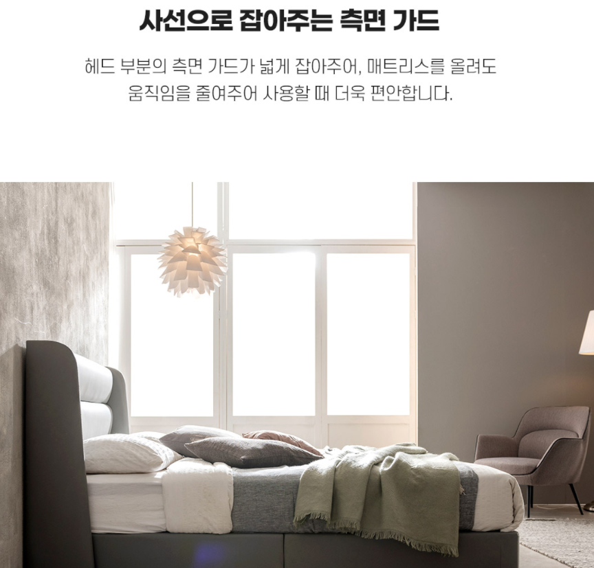 헤드 부분의 측면 가드가 넓게 정리되어 매트리스를 올려도 움직임을 줄여 사용할 때 더욱 편안합니다.