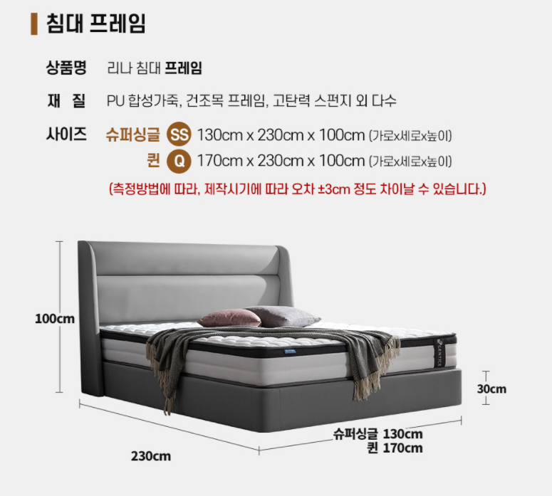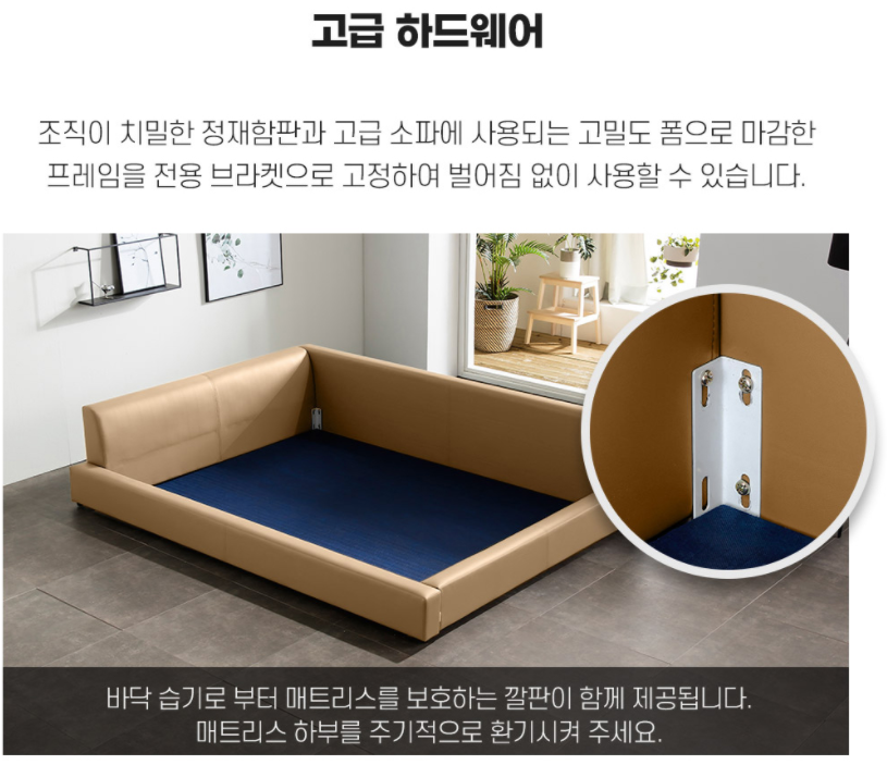 고급 하드웨어 조직이 치밀한 정재 상자 판과 고급 소파에 사용되는 고밀도 폼으로 마감한 프레임을 전용 브래킷으로 고정하여 벌어짐 없이 사용할 수 있습니다.+ 바닥의 습기로부터 매트리스를 보호하는 깔판이 함께 제공됩니다.매트리스 하부를 주기적으로 환기하세요!