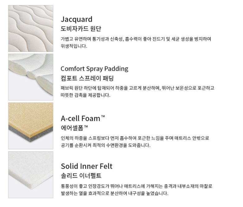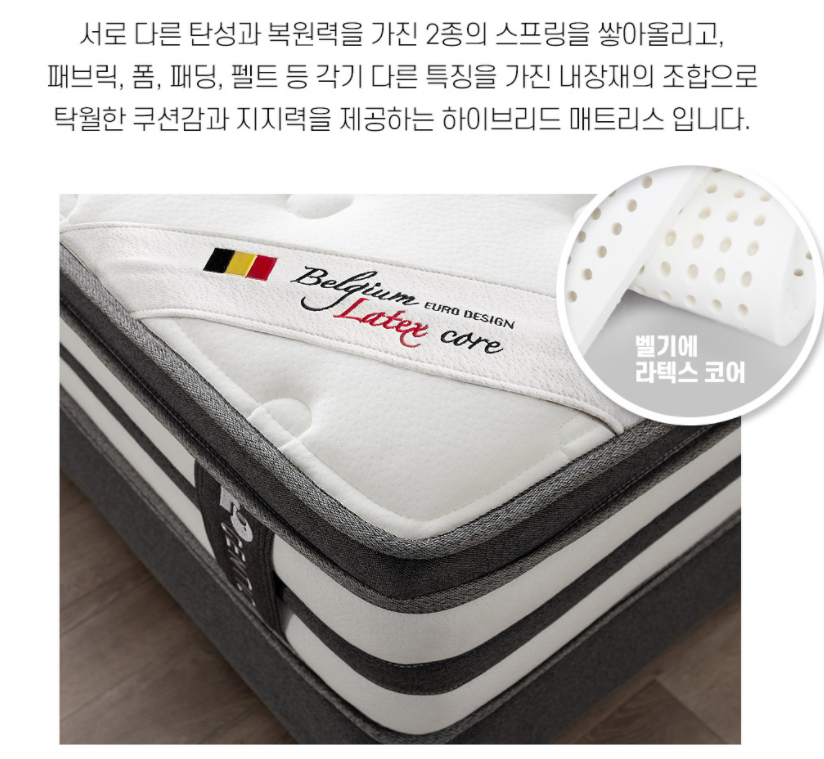 다른 탄성과 복원력을 가진 2종의 스프링을 쌓아 올렸으며 패브릭 폼, 다운펠트 등 각기 다른 특징을 가진 내장재 조합으로 뛰어난 쿠션과 지지력을 제공하는 하이브리드 매트리스입니다!