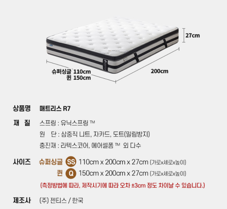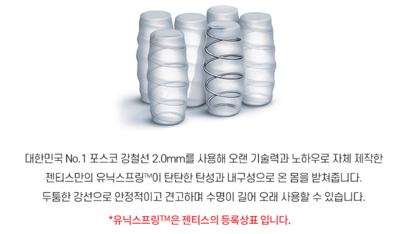 포스코 강철선 2.0MM을 사용하여 오랜 기술력과 노하우로 자체 제작한 젠티스만의 유닉 스프링이 탄탄한 탄성과 내구성으로 온몸을 지탱해줍니다.안정적이고 견고하며 긴 수명을 가집니다.