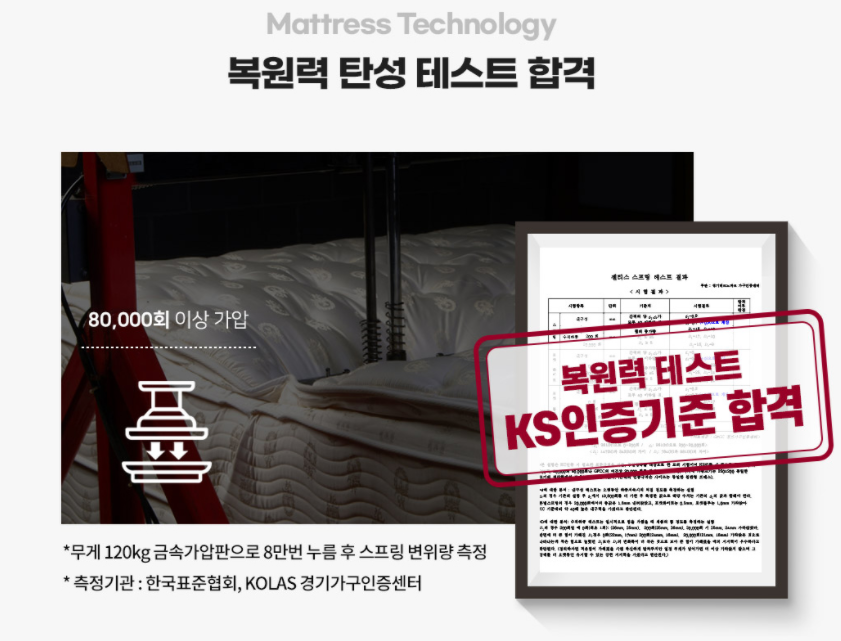 국가표준 KS 인증기준 매트리스 복원력 탄성테스트 합격국내 최고의 공인시험기관의 엄격한 탄성테스트를 거쳐 제작된 젠티스만의 유닉스프링이 소음, 흔들림, 틈새를 효과적으로 차단합니다.