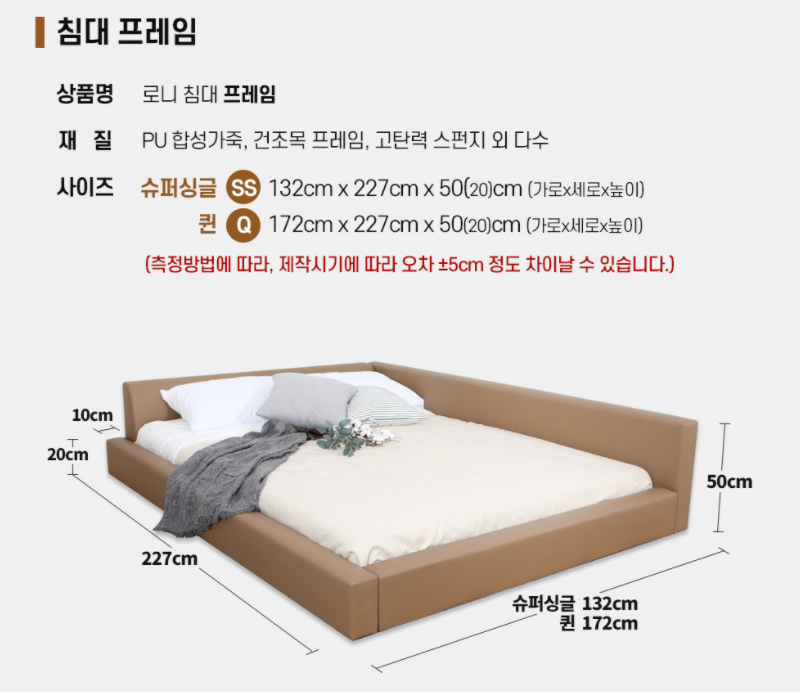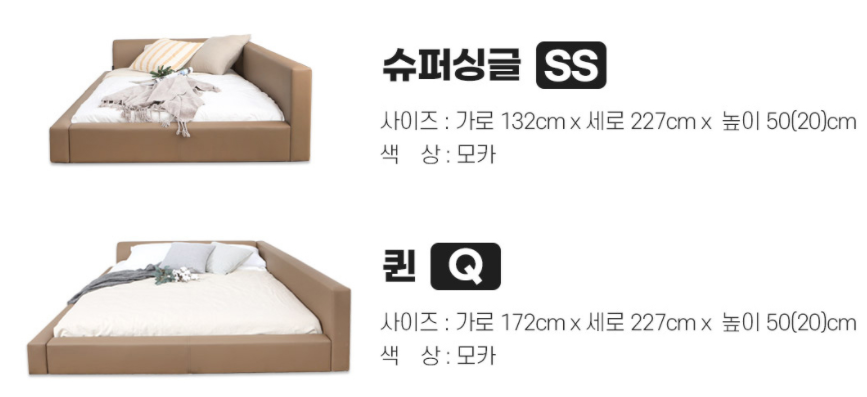 슈퍼 싱글 SS 사이즈와 퀸 Q 사이즈표입니다. 색상은 모카로 준비되어 있습니다.