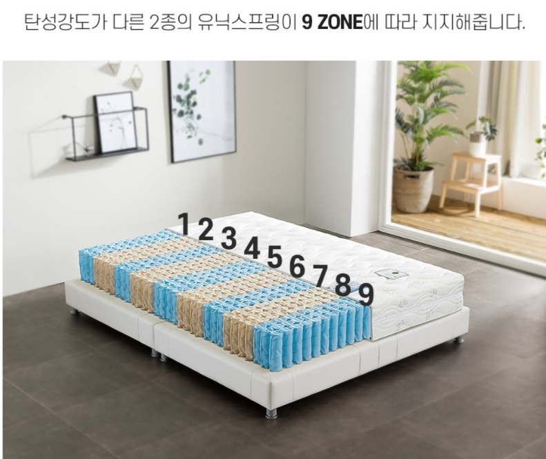 탄성 강도가 다른 2종의 유니크 스프링이 9ZONE에 의해 지지됩니다.무려 9존으로 나누어져 있어서 자신의 몸에 딱 맞게 지탱해 주는 거죠?이 부분 체크해주세요! 9개!