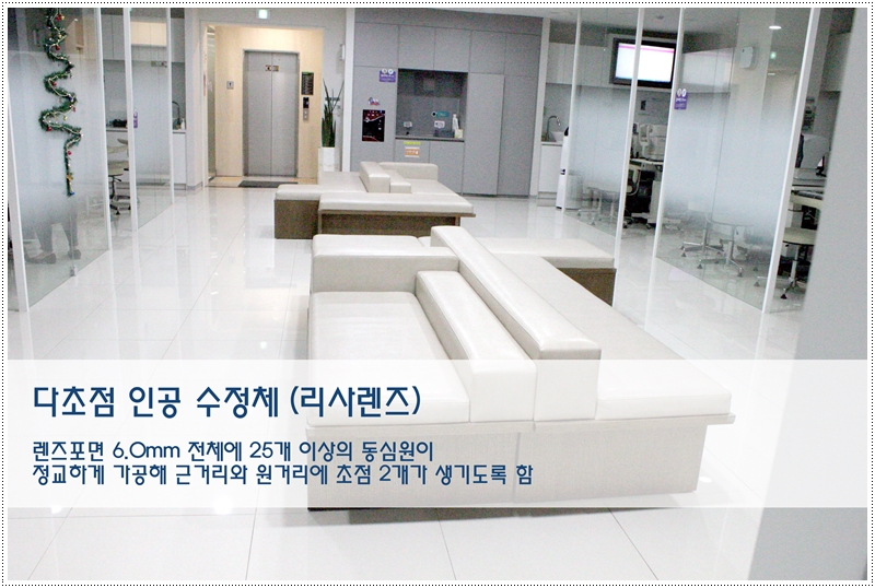원거리와 근거리를 동시에 잘 볼 수 있어 수술 후 돋보기 없이도 편리한 생활을 할 수 있는 환경을 제공하며, 작은 1.5mm 절개창으로 수술이 가능하여 난시 발생을 최소화할 수 있다는 장점이 있습니다. 또한 이전 노안 교정 렌즈의 가장 큰 문제점으로 꼽혔던 근거리 시력, 야간 시력 장애, 달 표면이나 빛의 찌든 현상 감소 등을 들 수 있습니다.
