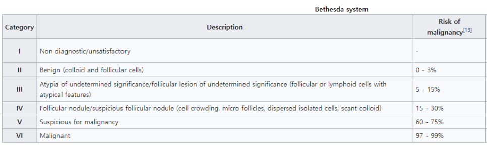검사를 받고 결과에 대해 좀 알아보겠다.갑상선 세침 검사 결과는 베네스다 시스템이라는 분류를 사용하는데 악성 의심 확률에 따라 1단계부터 6단계까지 나뉜다고 한다.1~2단계면 양성으로 단계가 높아질수록 악성일 확률이 높아진다.