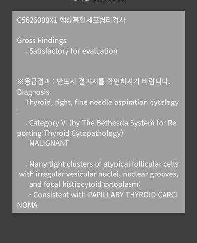 결과까지는 8일 정도 걸렸고 검사 결과 들으러 가는 지하철에서 땡큐이비인후과 앱에 알람이 울려 들어가 보니 결과가 이미 나와 있었다.영어라서 당황스러웠지만 곰곰이 살펴보니 ‘카테고리 6m alignant’라는 글자가 보였다.99% 암이었다.