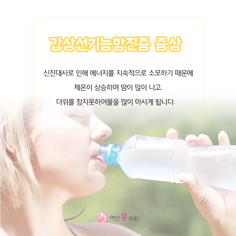 우리 몸에 이상이 생기면 여러 가지 증상으로 신호를 보냅니다. 하지만 일상생활에서 가벼운 증상과 비슷해 대부분의 사람들이 대수롭지 않게 생각하고 방치하는 경우가 많습니다. 하지만 특정 증상이 3주 이상 지속된다면 한 번쯤 자신의 몸에 문제가 생긴 것은 아닌지 의심해 보는 것이 좋습니다. 오늘은 열이 나고 땀이 많이 나는 증상으로 시작되는 갑상선 항진증 증상에 대해 알아보고 관리에 도움이 되는 식생활 습관을 소개해 드리도록 하겠습니다.