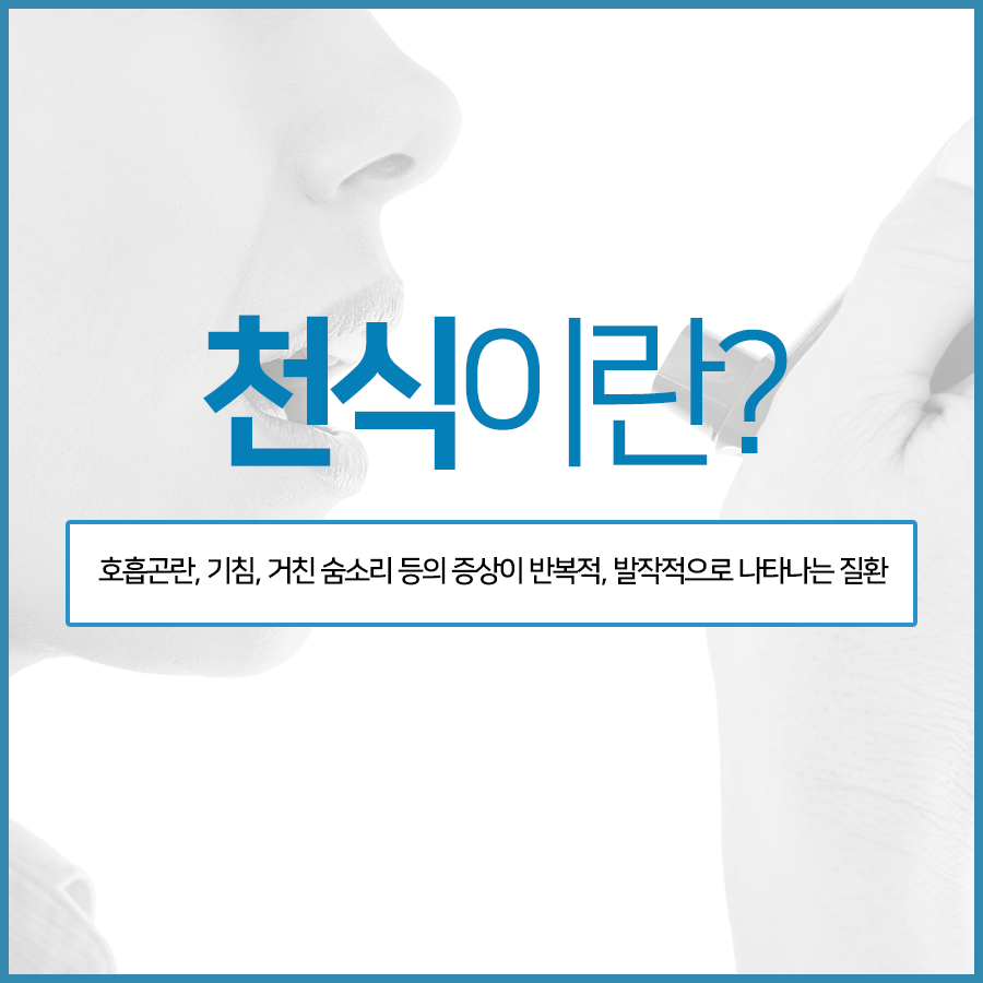 천식기관지는 폐로 연결되는 통로 역할을 하는데 특정 원인물질에 노출되어 염증을 일으키고 기침이 나거나 호흡곤란, 숨이 막히는 등의 증상이 반복적으로 발생하는 것을 천식이라고 합니다.