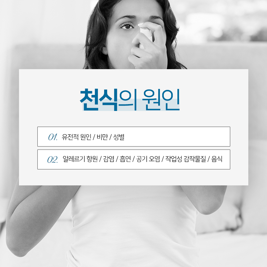 그리고 유아기에 다양한 바이러스에 의한 감염으로 발생하는 경우도 있으며, 공기 오염이 심한 경우 흡연, 작업 환경에 노출되는 다양성 감작 물질에 의해 발생하는 것으로 알려져 있습니다.