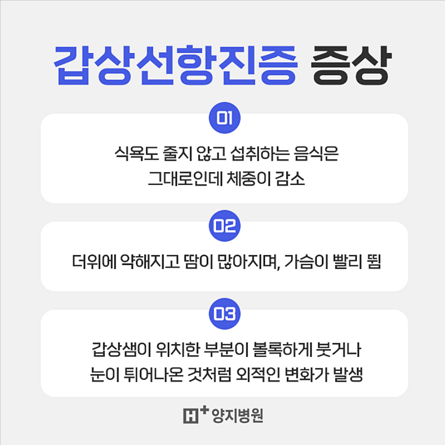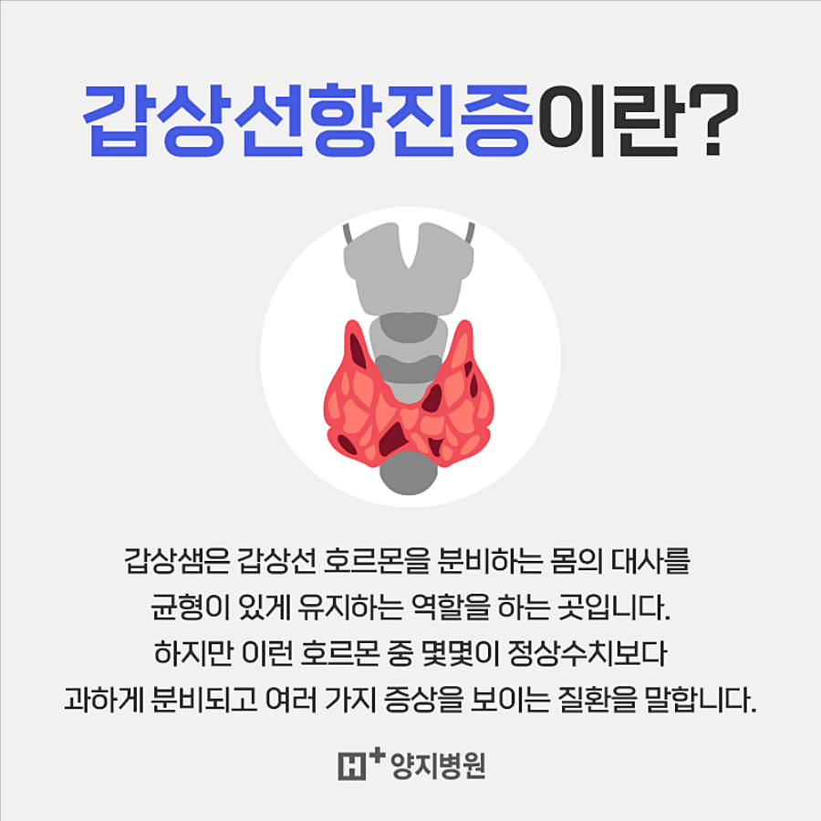 이러한 양상을 보이는 것이 갑상선기능항진증인데, 병원에 가지 않고 방치하면 고열이나 심부전이 발생해 생명에 위협을 줄 수 있는 질환입니다.