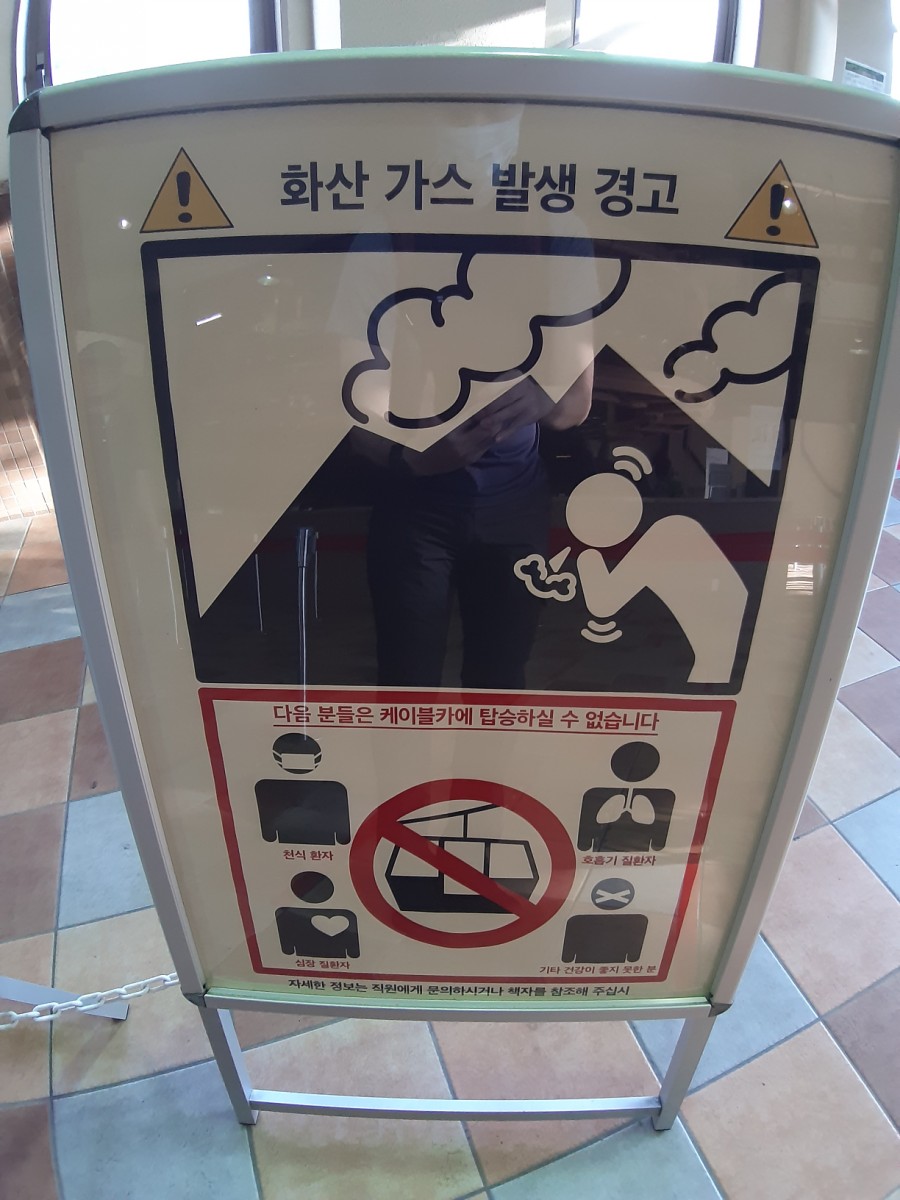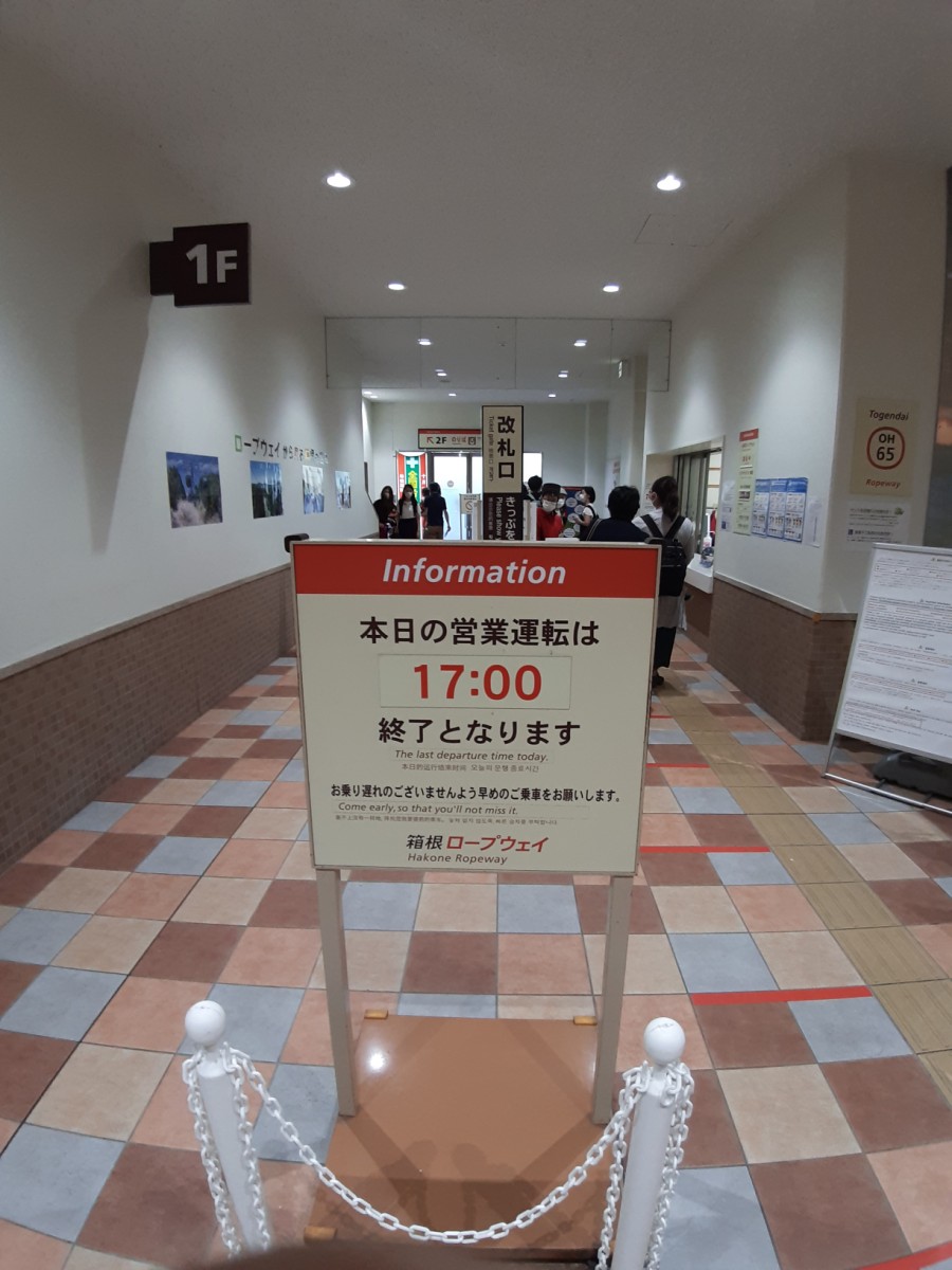 로프웨이(케이블카) 운영시간은 오후 5시까지라는 안내표지판. 오후 5시가 지나면, 도겐다이에서 소운잔까지의 교통 기관이 없으므로 주의해 주시기 바랍니다. *도원대 – 선석원 – 고라를 도는 등산버스가 있습니다.중. 매캐한 유황 냄새가 아주 심한 곳입니다. 예민한 분들은 오와쿠다니를 패스할 것을 권합니다. 유람선에 내리는 선착장에서 직결된 로프웨이 승강장
