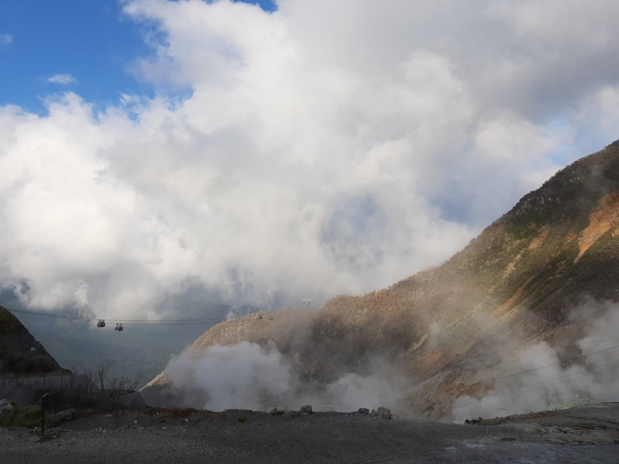 오와쿠다니의 약 3000년 전 하코네 화산의 마지막 분화에 의해 생긴 화구의 일부라고 합니다. 이미 로프웨이 안에서 여기에서 분출되는 연기와 코를 찌르는 유황 냄새가 대단합니다.