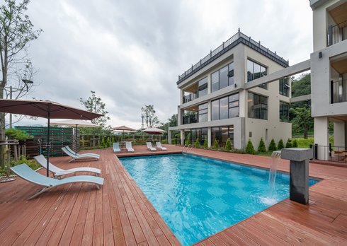 경상북도 풀빌라 까사로마는 꽤 큰 규모의 청도 펜션이다.여러 동으로 되어 있으며 수영장도 동마다 있다.대충 살펴보면 개인 수영장이 있는 수영장 빌라가 2동이고 나머지 수영장은 공용 수영장이다.까사로마는 지은 지 얼마 안 돼서 외관부터 내부까지 너무 예쁘다.맑은 청도 공기에 기분까지 시원해진다.앞을 봐도 산! 뒤를 봐도 산! 눈까지 보양이다.