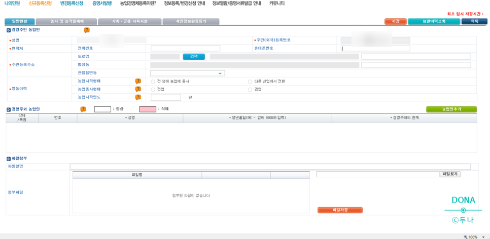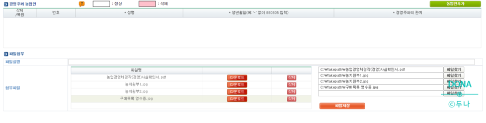 성명, 주민등록증은 자동으로 세팅되므로 연락처, 주민등록증상의 주소, 농사이력 등을 선택해 준다.경영자 이외에 인정받고 싶은 농업자가 있으면 적어주라, 없으면 써주지 않는다.