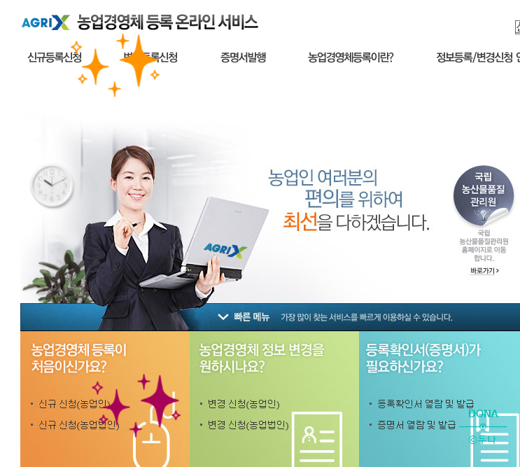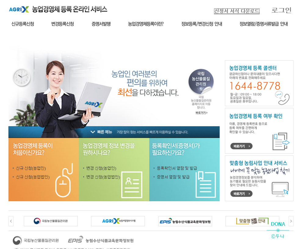 바로 여기서 등록을 하는 것이다.다이렉트 어드레스 http://uni.agrix.go.kr/docs2/potal/main.html 문의고객의 편의를 위해 최선을 다하겠습니다. 농업 경영등록이 처음인가요? 신규 신청(농업인) 신규 신청(농업법인) 농업경영정보 변경을 원하십니까? 변경신청(농업인) 변경신청(농업법인) 등록확인서(증명서)가 필요합니까? 등록확인서 열람 및 발행증명서 열람 및 발행농업경영체등록 콜센터, 궁금하신 점이나 문의사항이 있으시면 아래 번호로 전화주시면 감사하겠습니다. 1644-8778 월 ~ 금 : 09:00 ~ 18:00 토요일과 일요일, 공휴일 휴무입니다. 농업 경영자 등록 유무의 확인 성명, 경영자 등록번호 등으로 간단하게 등록할 수 있는지 여부…uni.agrix.go.kr