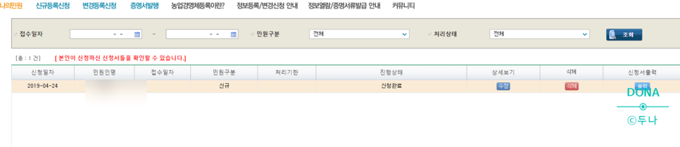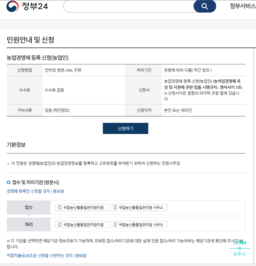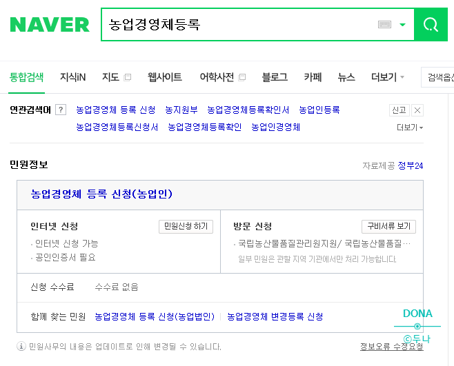 네이버에 농업경영체등록 검색하는 민원정보 나옴, 민원신청 클릭 ->