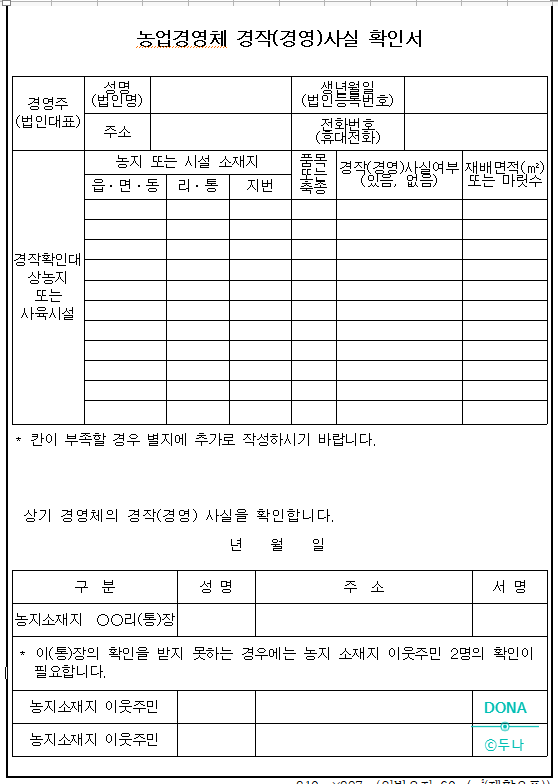 여기서 경작사실확인서를 검색하면 게시문이 한 건 나오길래 주워왔다.이거 프린트 하면 돼.