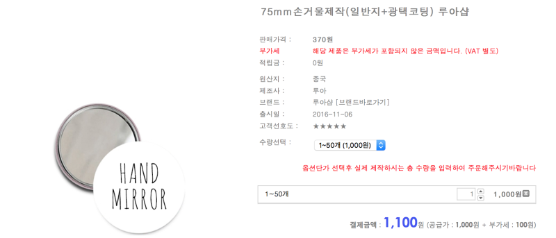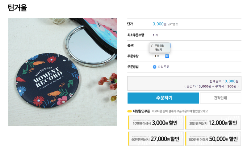 무광손거울 제작은 최소수량이 1,000개로 조금 많은 편입니다. 아쉽게도 그 이하 수량은 제작이 불가능하며 유광으로 선택해주셔야 합니다. 고급 재질임에도 불구하고 대량 구매 혜택 가격으로 개당 1,000원 이하로 구입할 수 있습니다. 제작 기간