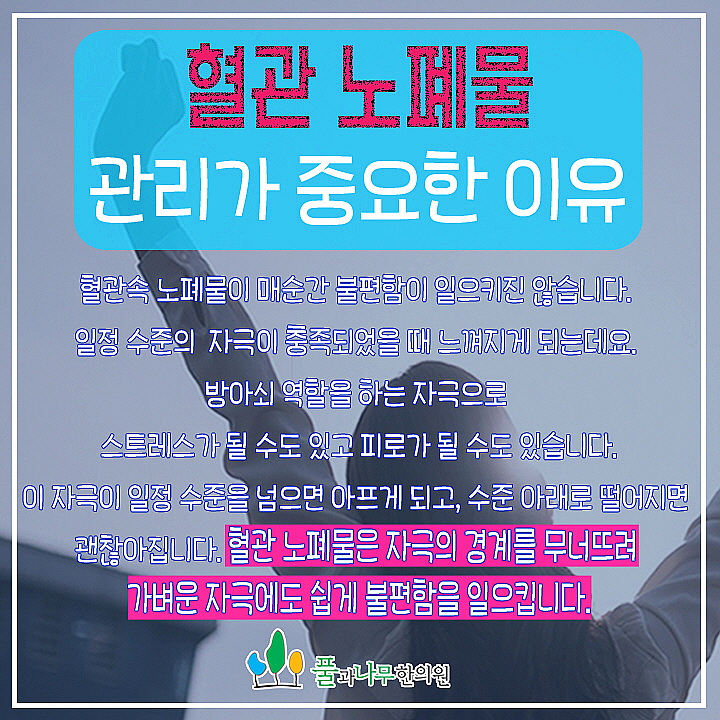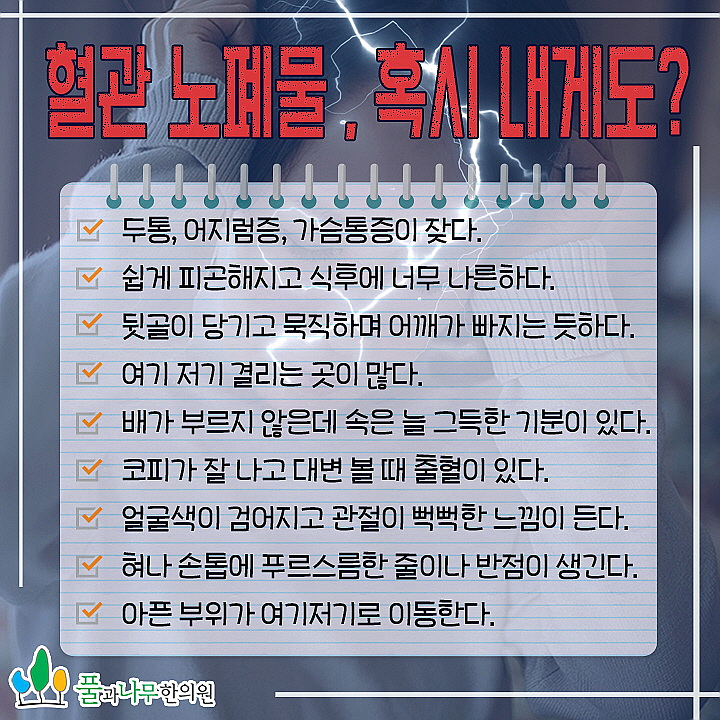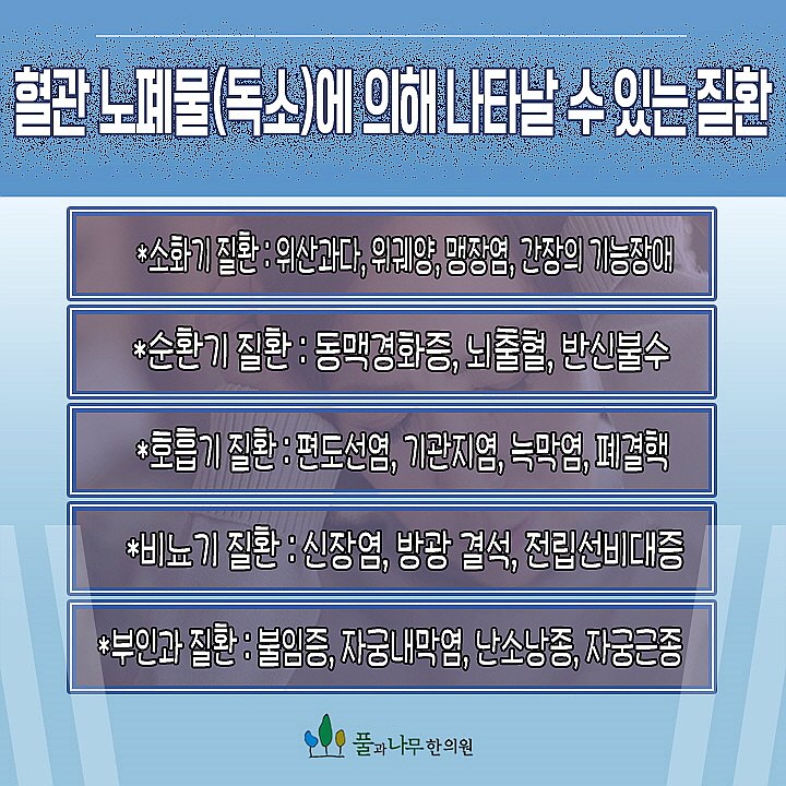 - 소리 없는 소용돌이라고도 할 수 있을 정도로 심각한 질환에 해당하는 고혈압은 혈관질환을 비롯해 심장, 신장, 망막질환은 물론 뇌졸중의 원인이 될 수 있습니다. 이것은 일상의 질을 조금 떨어뜨리는 데 그치는 것이 아니라 실제로 살아가는 데 큰 영향을 미칠 수도 있기 때문에 반드시 유의해서 치료해야 하는데 이렇게 고혈압이 나타나는 이유는 무엇일까요? 여러 요인이 있지만 한방의 관점에서는 가장 중요한 요인으로 혈관 노폐물인 어혈을 꼽고 있습니다.