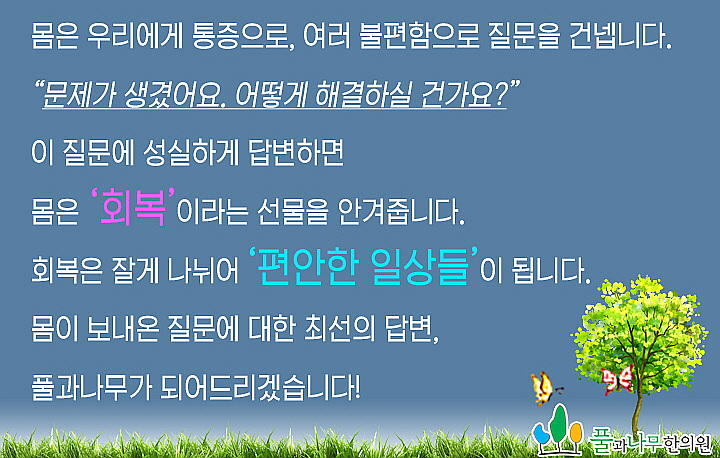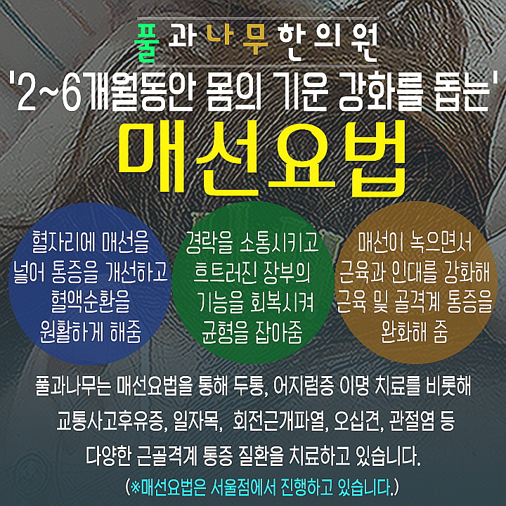 물론 각각의 몸 상태에 따라 다양한 방법을 병행 적용하면 보다 빠르게 건강한 일상으로 돌아가는 데 도움이 됩니다. 다만 이는 임의로 선택하는 과정이 아닌 진단을 통해 상태를 파악하고 결정하는 것이 가장 바람직합니다.