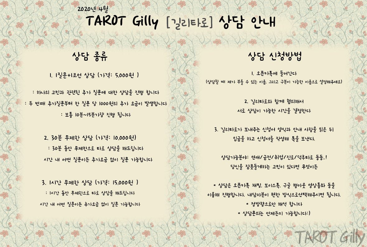 읽기 자체가 세세하게 풀어드릴 수 있기 때문에 내담자분께서도 정리된 읽기 내용에 대한 이해도가 높고 오래 보기 편해서 좋다고 말씀하셨습니다.제 입장에서는 시간과 에너지가 더 드는 부분이긴 하지만 그래도 장점이 많이 있기 때문에 공식적으로 이메일 타로 상담을 추가했습니다.