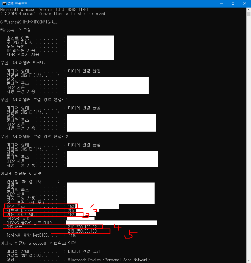 여기서 중요한 것은,<이더넷 어댑터 이더넷>부분에 있는 IPV4 주소와 기본 게이트웨이입니다. 여기 있는 기본 게이트웨이는 와이파이 라우터의 기본 게이트웨이가 아니라 집에 있는 인터넷선, 즉 sk브로드밴드, kt 유무선 라우터의 게이트웨이입니다. IPV4 주소는 나중에 포트 포워딩을 할 때 쓰는 IP 주소입니다.