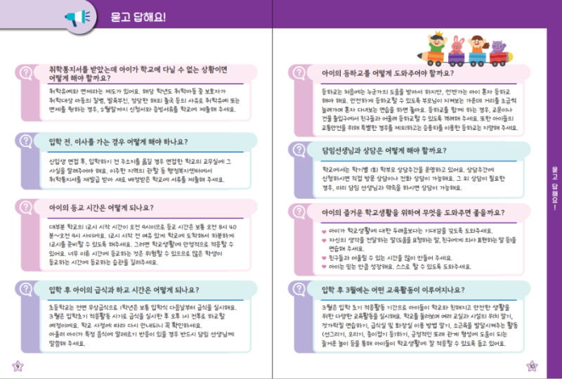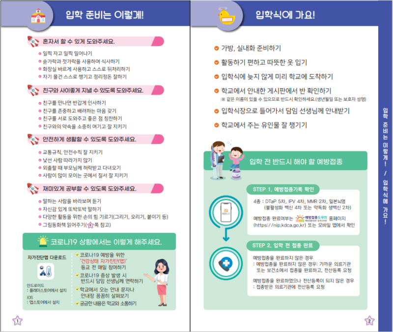 입학 준비는 이렇게 혼자 할 수 있게 도와주세요.친구들과 친해질 수 있도록 도와주세요.안전하게 생활할 수 있도록 도와주세요.즐겁게 공부할 수 있도록 도와주세요.