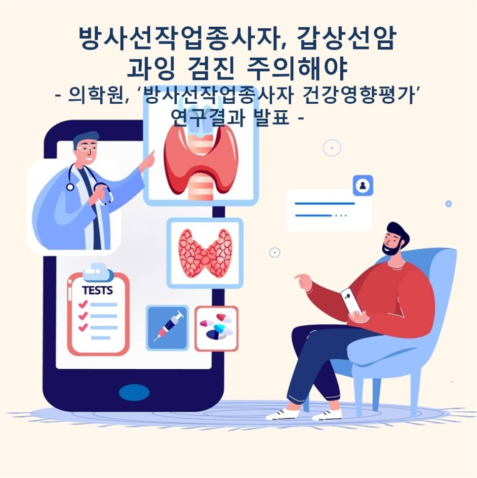 또한 한국에서 갑상선암 과잉진단이 사회적 문제로 대두되고 2015년 갑상선암을 포함한 7대 암 검진 권고안*이 제정된 이후의 검진율 비교에서도 방사선 작업종사자의 검진율은 일반인보다 1.4배 높으며 이는 방사선 작업종사자의 건강관리를 위한 다양한 직장검진 등과 관련이 있는 것으로 추측되고 있습니다.의료서비스 이용의 용이성 종사자, 검진 시 유의사항에서 이번 연구결과로 연구팀은 과잉검진으로 인한 갑상선암 발견은 의과학적 타당성 측면에서 논란이 있으며, 실제로 특정 집단에서 갑상선암 발생원인 규명을 어렵게 할 수 있으므로 의료서비스 이용이 상대적으로 용이한 종사자의 과잉검진에 대한 세심한 주의가 필요하다는 것을 확인하였습니다.