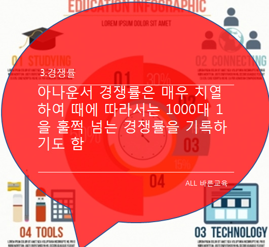 아나운서 경쟁률은 워낙 치열해서 때에 따라서는 1000대 1을 훌쩍 넘는 경쟁률을 기록하기도 해요.