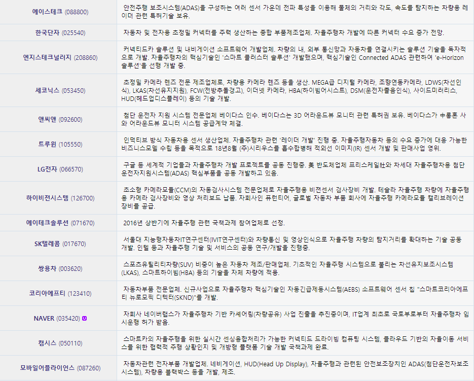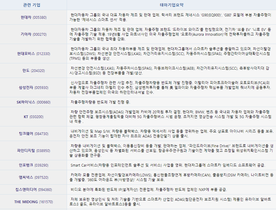 안녕하세요 탱크입니다 오늘은 어떤 하루를 보내고 계신가요?저는 오늘 사무실을 정리하고 집에 돌아왔습니다. 몇 달 전부터 계속 다니던 회를 그만두고 왔어요.그래서 이제 곧 포스팅할 시간도 많고, 다양한 정보에 대해서 포스팅해보려고 합니다. 요즘 현대차와 기아차주가 많이 달렸어요. 최저점으로 잡았으면 이미 300%의 수익을 얻으신 분도 있어요. 하지만 밑바닥에서 며칠 만에 인양했기 때문에 사실상 진입이 어려운 부분이 있다고 봅니다.포스팅은 자동차 주가 상승하고 있는 상황에서, 우리는 자율주행 시대에 맞춰 어떤 주식을 인수해야 하는지 알아보고 관련 정보를 정리했습니다. 종목뿐만 아니라 관련된 핵심 기술에 대해, 그리고 순위를 알아보면서 이웃과 소통하는 시간을 갖도록 하겠습니다.1.1 자율주행은?2. 현 현대 기아차의 기술력은? 3. 관련주는?자율주행은 운전자가 핸들, 가속 페달, 브레이크 등의 차량을 조작하지 않아도 스스로 주행하는 자동차를 말합니다. 최근 자동차 관련 기술이 발달하면서 전기차 업계의 테슬라뿐 아니라 국내외 주요 자동차 업계도 자율주행차 개발에 박차를 가하고 있습니다. 이에 따라 한국 정부도 자율주행차 관련 규제를 대폭 완화하는 등 관련 산업 육성을 위한 정책 역량을 집중하고 있습니다.