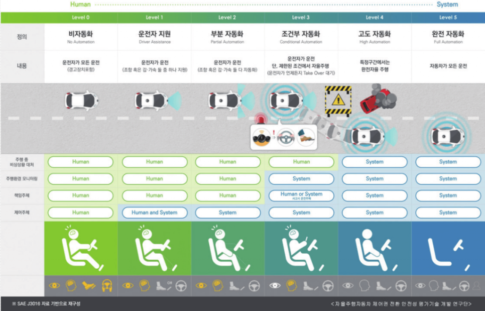 자율주행은 실현 수준에 따라 여러 단계로 나뉩니다 각 메이커에 따라 스텝 분류의 정도는 조금씩 다릅니다. 일반적으로는 국제 자동차 기술자 협회에 의한 0~5 단계에 따릅니다.