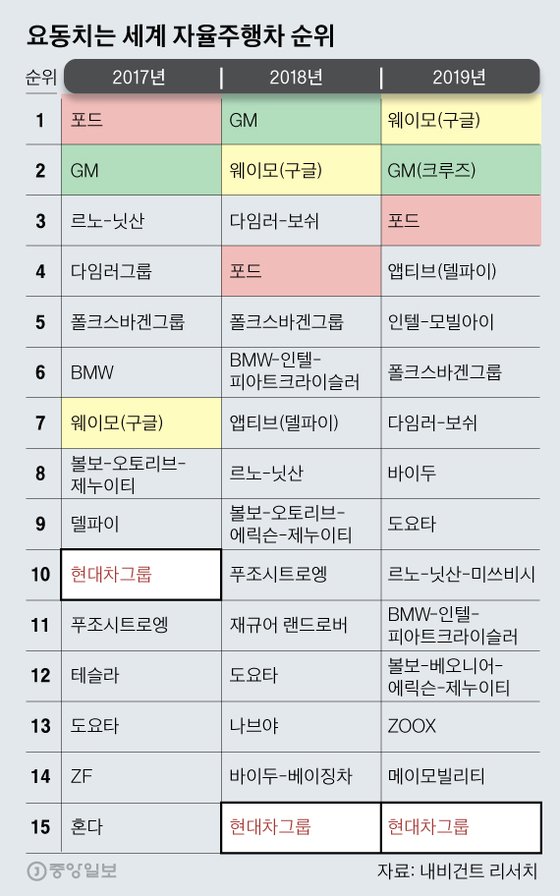 자율주행기술 수준을 평가하는 ‘나비간트리서치’ 자율주행 순위에서는 현대차가 역대 최고를 기록했습니다. 현대차는 2년 연속 10위 안에 들지 못했지만 지난해 자율주행 전문업체 앱티브와 조인트번처 설립에 합의하면서 순위를 크게 올렸습니다.