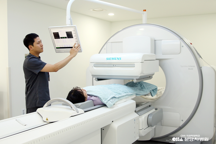 암이 어느 부위로 전이됐는지 확인 ‘PET/-CT’란 양전자 방출 단층촬영검사(Positron Emission Tomography, PET)와 CT가 결합된 검사법으로 질환의 기능적 영상(PET)과 형태적 영상(CT)을 동시에 획득해 우리 체내 조직의 생화학적 대사 상태를 확인하고 질환을 검사하는 첨단 장비입니다. 검사 목적에 따라 체내 생리학적, 생화학적 변화를 반영하는 방사성의약품을 인체 내에 투여하고 그 분포를 PET/CT로 영상화합니다.암 진단에 가장 많이 사용되는 방사성의약품으로는 ‘포도당 유사체’가 있으며, 이를 통해 암 병변의 당 대사를 측정하여 암 진단, 전이 발견 및 치료 반응 평가가 가능합니다. 각종 암의 림프절 전이, 복막 전이 확인이 필요할 때 대부분의 연구결과에서 PET/CT 검사가 CT보다 많은 병변을 발견한다고 보고되고 있습니다.분당차병원의 ‘PET-/CT’는 최대 384슬라이스 CT가 결합된 최신 PET-/CT로 촬영시간 중 피폭되는 방사선량이 기존 장비보다 60% 정도까지 대폭 줄어 신체에 미치는 방사능 영향을 최소화했습니다. 체내 당대사를 영상화함으로써 암 종괴 자체와 전이 발견, 치료 후 효과 판정, 재발병변 추적 등에 널리 이용되고 있습니다.또한 뇌의 당대사를 영상화하여 전반적인 뇌기능을 평가할 뿐만 아니라 뇌 속 베타아밀로이드 분포도의 영상분석을 통한 알츠하이머 치매진단에 이용되고 있으며 뇌의 도파민 전달체를 영상화하여 파킨슨병 등의 진단 및 평가에 큰 역할을 하고 있습니다.