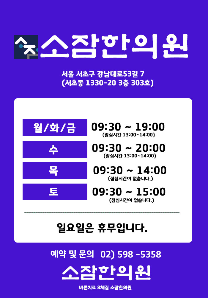 ★★네이버예약★★소잠한의원의 한방치료법에 관심이 있으시다면 아래 네이버예약링크를 통해 내원해주세요.- 피부질환으로부터 자유로워지는 그날까지 작은 잠이 함께합니다. – 면역질환을 25년간 연구해온 의료진! – 치료가 어려웠던 만성 피부질환 치료의 많은 임상경험을 가지고 있습니다. (23,000건 이상) – 해독, 체질개선, 면역강화를 통해 우리 몸의 모든 혈액이 맑아지는 날까지, 맑아진 혈액이 안정된 혈액순환을 통해 우리 몸의 모든 세포가 행복해지는 날까지 어머니의 마음으로 환자를 돌보며 끝까지 동행하겠습니다. -소잠은 소중한 생명에 대한 사랑입니다. 당신은 소중한 사람입니다.bit.ly