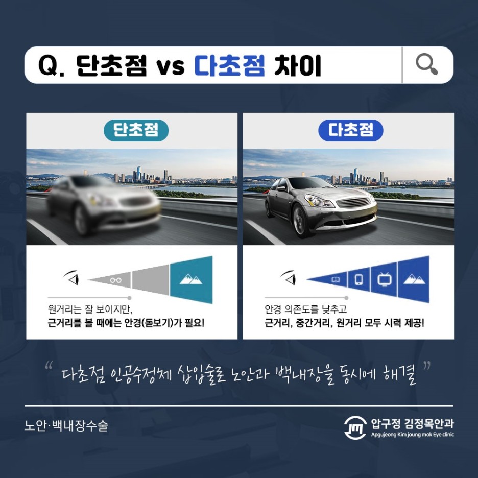 백내장은 기존 수정체는 적출하고 빈 공간에 인공렌즈를 삽입해 굴절률을 교정하는 과정을 거쳐야 했습니다.노화가 진행되면서 발생한 질환인 만큼 교정을 할 때는 근거리와 원거리를 포함한 시력 전반을 보완해야 했습니다.이때 단초점 렌즈를 사용할 경우 먼 거리의 물체는 잘 보이지만 가까운 거리에 위치한 물체를 보려면 별도로 안경을 써야 하는 경우가 많았습니다.이를 보완하기 위해 나온 것이 바로 다초점 렌즈였습니다. 근거리는 물론 중거리, 원거리도 잘 보이는 렌즈를 갖춰 내원자들의 만족도를 높이고 있었습니다.특히 본원은 연속초점과 다초점 모두를 구현할 수 있는 렌즈를 보유하여 적용하고 있어 시력을 전반적으로 상승시키는 것이 가능하였습니다.