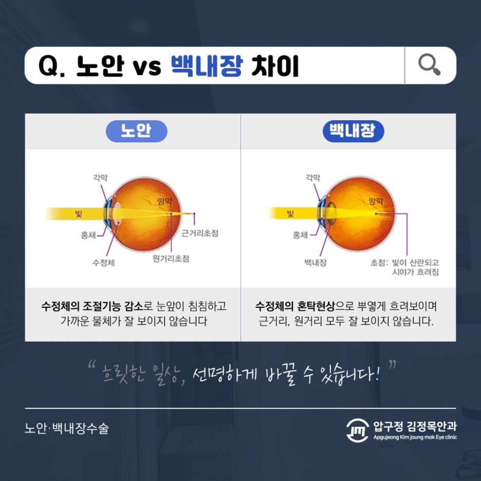 우리가 물체를 인식할 때는 빛이 수정체에 굴절돼 망막에 매치되는 과정을 거쳐야 했습니다.이때 노안이란 굴절이 일어날 때 조절력 기능에 이상이 생긴 것을 의미했습니다.노안은 먼 거리에 있는 물체보다 가까운 거리에 있는 물체를 보기가 어렵게 느껴지는 시력 이상 증상이 발생하는 경우가 많았습니다.노화로 인한 시력 저하는 다행히 돋보기나 안경 등을 착용하는 것만으로 보완할 수 있었습니다.반면 수정체 자체에 이상이 생겨 발생하는 백내장의 경우는 달랐습니다.혼탁한 수정체내로 인해 시야가 흐릿하게 보일 뿐만 아니라 빛을 제대로 통과시키지 못해 물체를 인식하는 것이 어렵게 느껴졌습니다.이런 경우 시력감소가 동반되는 경우가 많아 약물요법보다 수정체 내 내용물을 제거하는 과정을 실시해야 하는 경우가 많았습니다.