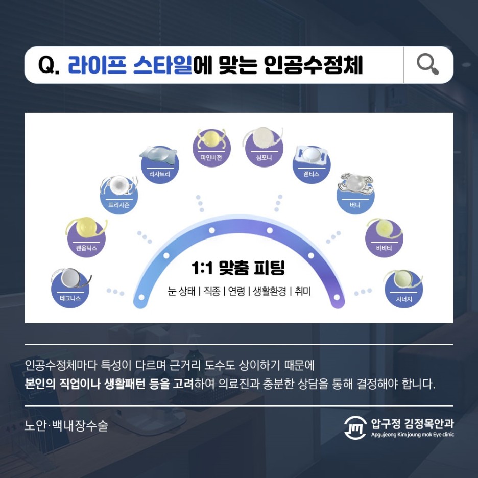 혼탁한 수정체 내용물을 제거한 후에는 인공렌즈를 삽입하는 과정을 거쳐야 했습니다.이때 중요한 것은 일대일 맞춤 피팅을 통해 현재 자신의 생활환경에 잘 맞는 것을 선택해야 한다는 것이었습니다.인공수정체는 종류에 따라 연속초점, 다초점 등 구현할 수 있는 기술 차이가 있고 특성도 다르기 때문이었습니다.현재 가지고 있는 직업이나 활동 패턴, 나이 등을 충분히 고려한 후에 선택해야 족도도 높게 나올 수 있기 때문에 저희 병원에서는 맞춤 피팅 작업을 반드시 실행하고 있었습니다.따라서 정밀 검사를 실시하여 과학적 기반을 바탕으로 내원자에게 맞는 렌즈를 찾고 있었습니다.이후 안심할 수 있는 관리 및 제거 시스템을 통해 수정체를 교체하는 작업을 진행하였습니다.