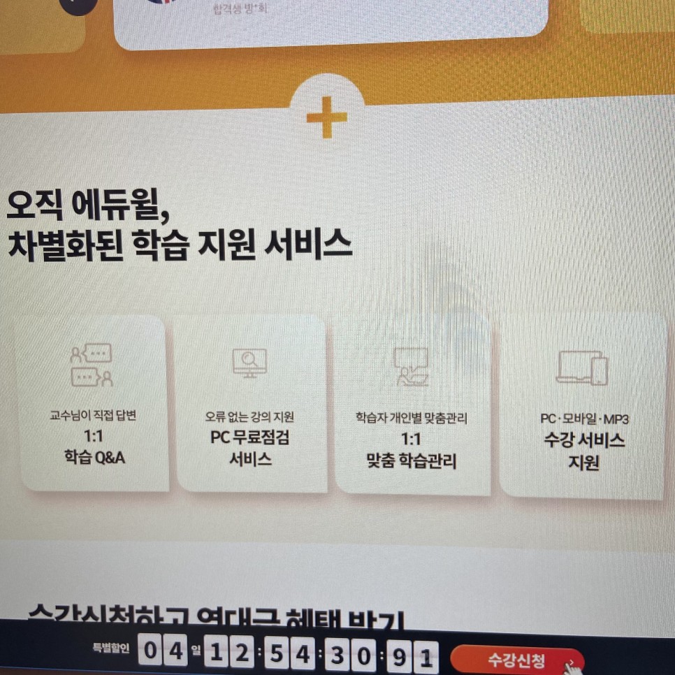 학습자를 위해 제공된 지원 서비스에서는 1:1 학습 Q&A를 활용할 수 있었습니다.이 밖에도 PC 무료점검 서비스와 학습자 개인별로 맞춤관리를 받을 수 있는 맞춤학습관리시스템, PC와 모바일 등의 수강서비스가 동시에 지원됐습니다.